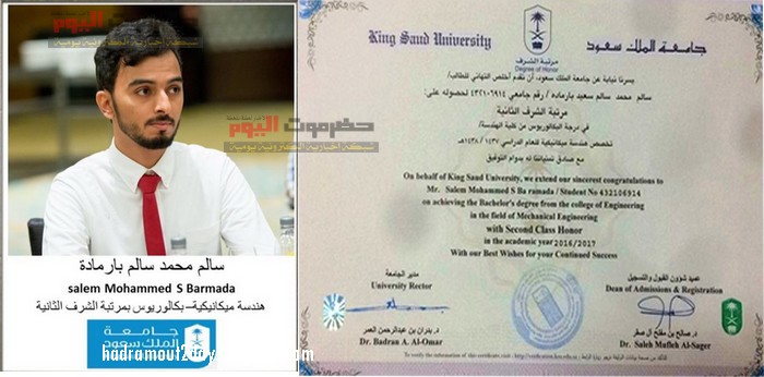 مرتبة الشرف الثانية للطالب الحضرمي المهندس سالم محمد بارمادة من كلية الهندسة بجامعة الملك سعود المكلا الآن