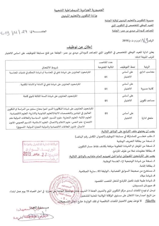 اعلان توظيف لدى المعهد الوطني المتخصص في التكوين المهني بولاية الجلفة