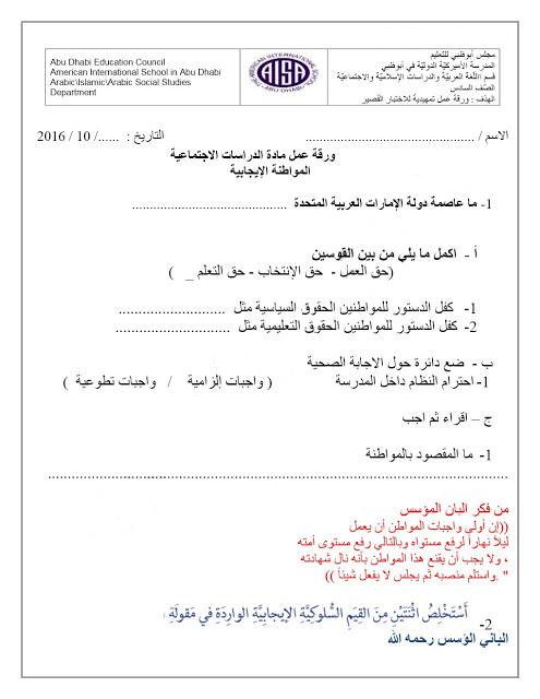 ورقة تقويم المواطنة الايجابية الوحدة الثانية بدون حل دراسات اجتماعية صف سادس فصل أول مدرستي الامارتية