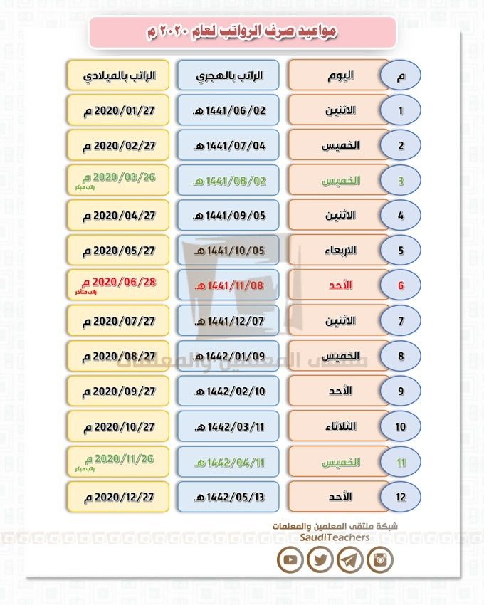 ملتقى المعلمين والمعلمات Sur Twitter مواعيد صرف رواتب الموظفين 1441هـ 2020م