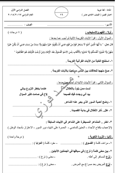 نموذج امتحان في مادة اللغة العربية الصف الحادي عشر لغة عربية الفصل الأول المناهج الكويتية