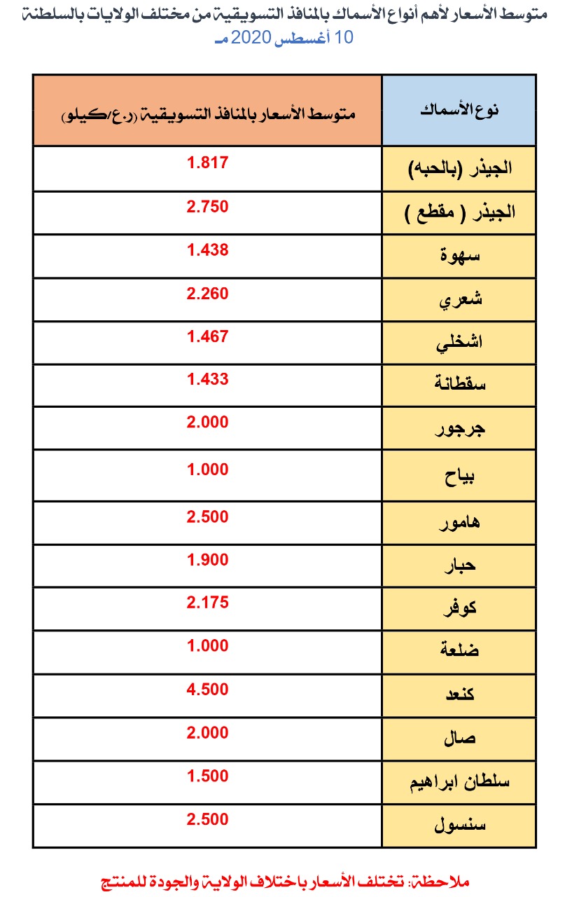O Xrhsths وزارة الثروة الزراعية والسمكية وموارد المياه Sto Twitter اط لــع علــــى متـوسط الأسعار لأهم أنواع الأسمـاك من المنافذ التسويقية مـن مختلف ولايات السلطنة ليوم الأثنين 10 أغسطس 2020م